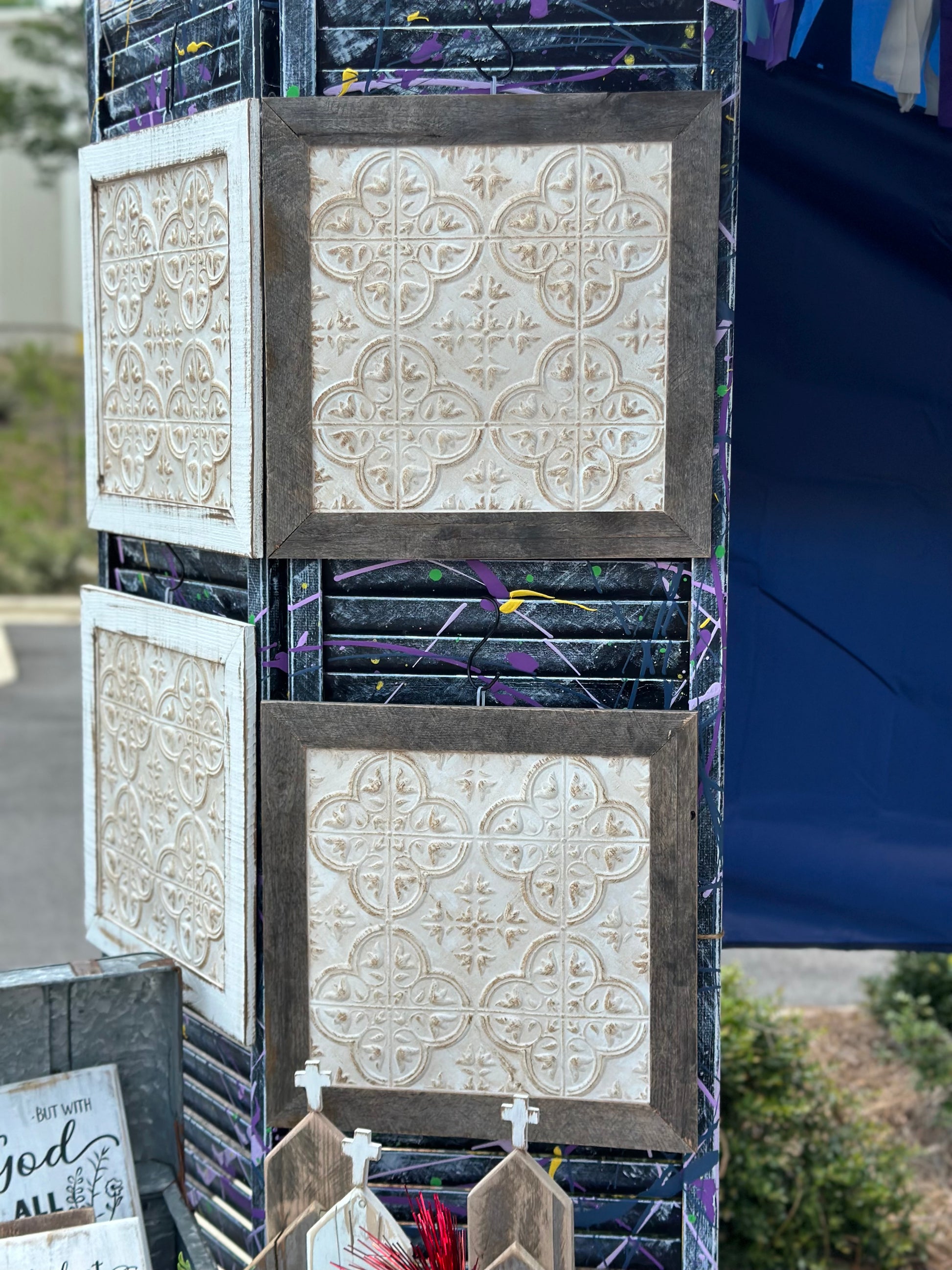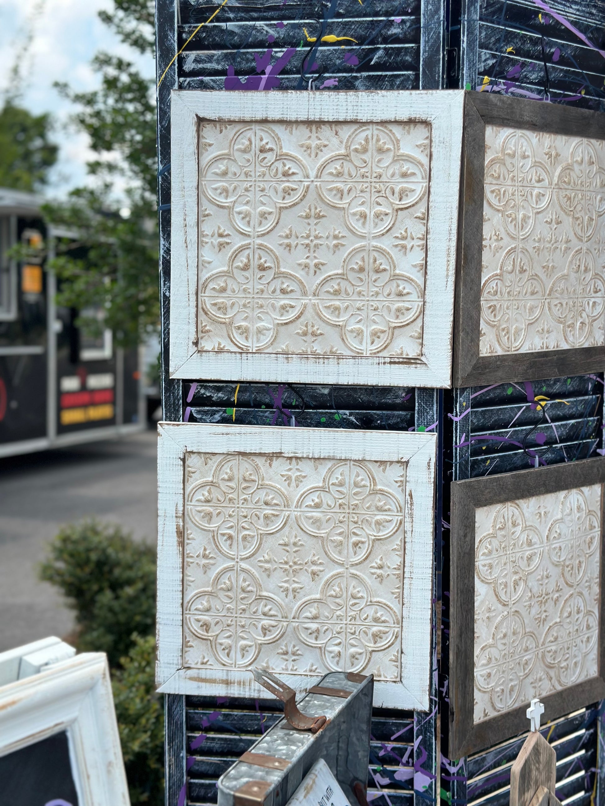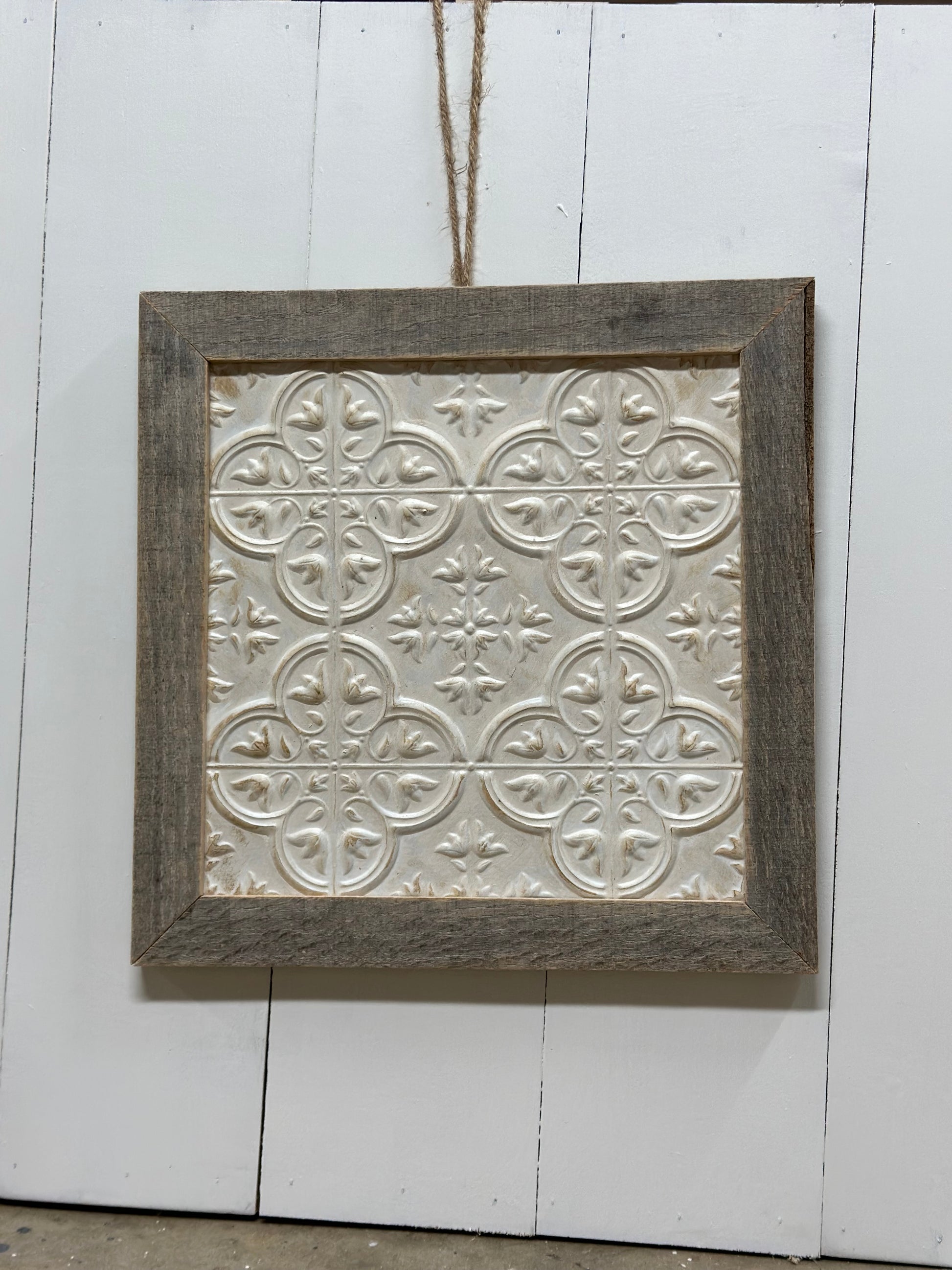 Bring timeless farmhouse charm into your home with these handcrafted distressed tile wall art pieces, beautifully framed in authentic reclaimed wood. Each tile features a vintage-inspired embossed design finished in a distressed white wash, creating a warm and rustic aesthetic.