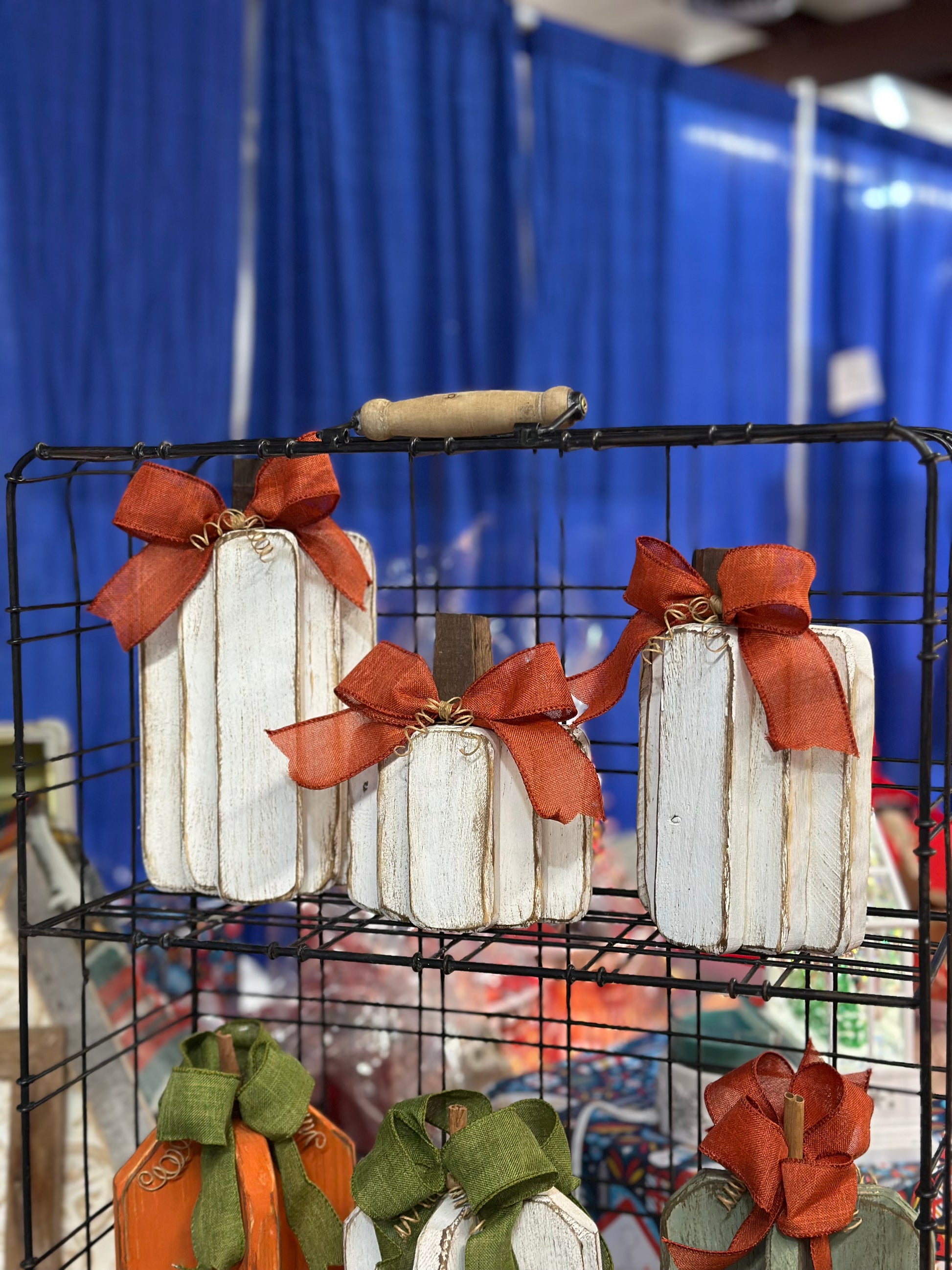 Each pumpkin is adorned with a stained reclaimed wood stem, twirled jute wire tendrils, and finished with a festive ribbon (choose from Fall Orange, Mustard Yellow, Fall Green, or Orange Plaid).